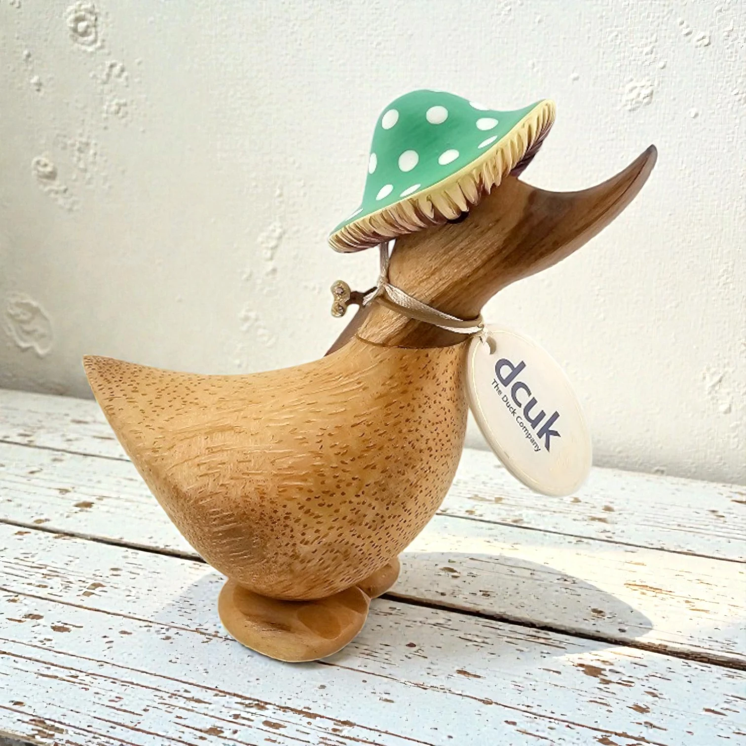 Each Toadstool Folk duckling is handcarved in Indonesia from a single piece of bamboo root, which means the grain, the tone, and the posture are unique to the individual. The warm honey timber shifts from piece to piece, marked by the natural texture of the root and the hand of the person who shaped it. There is no paint on the body, no costume beyond the hat. Just bamboo, carved with care into something that feels like it wandered in from somewhere older and quieter than here.