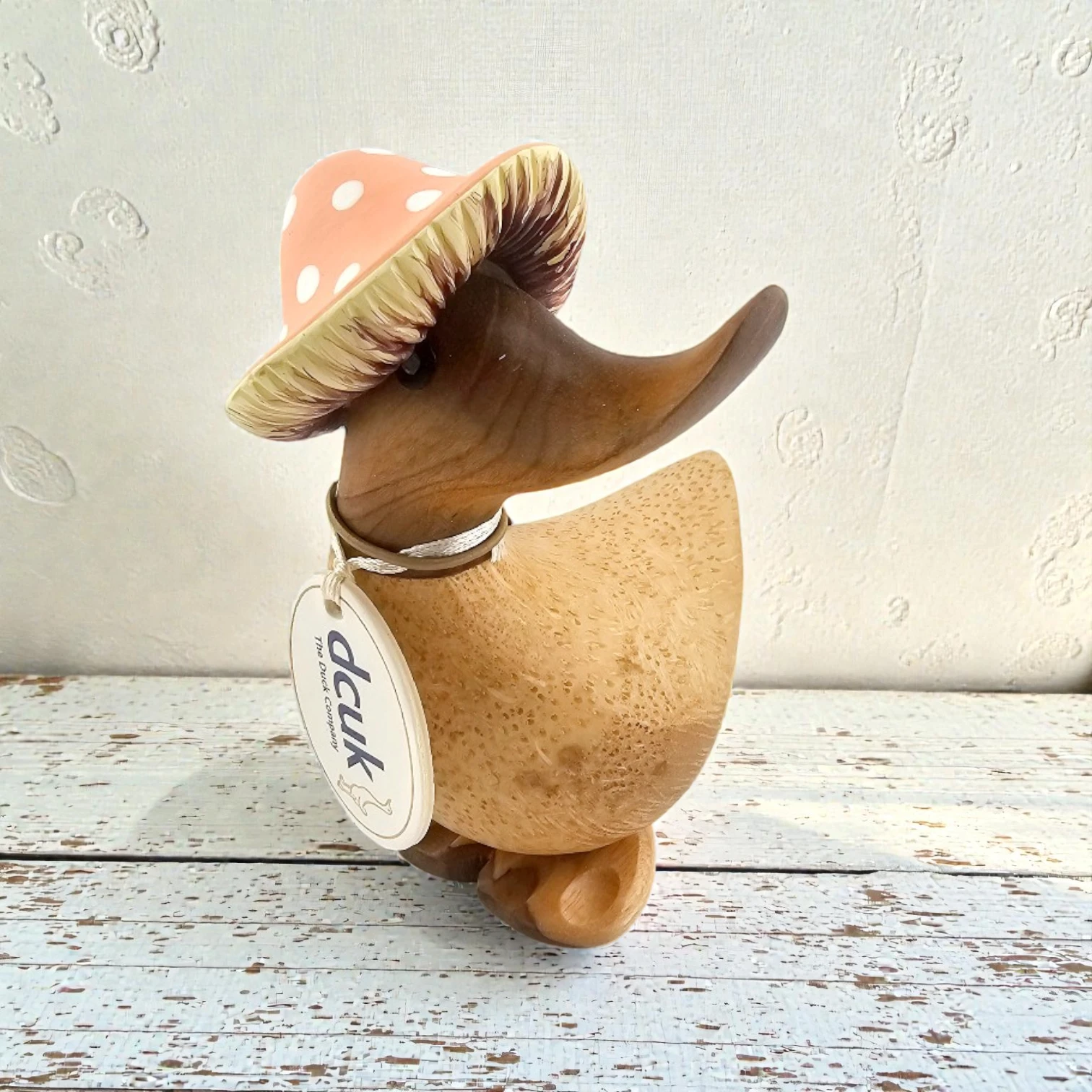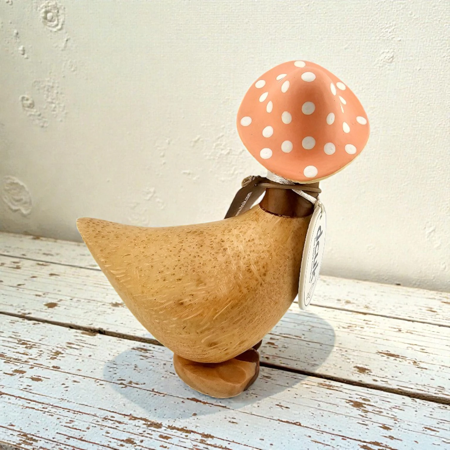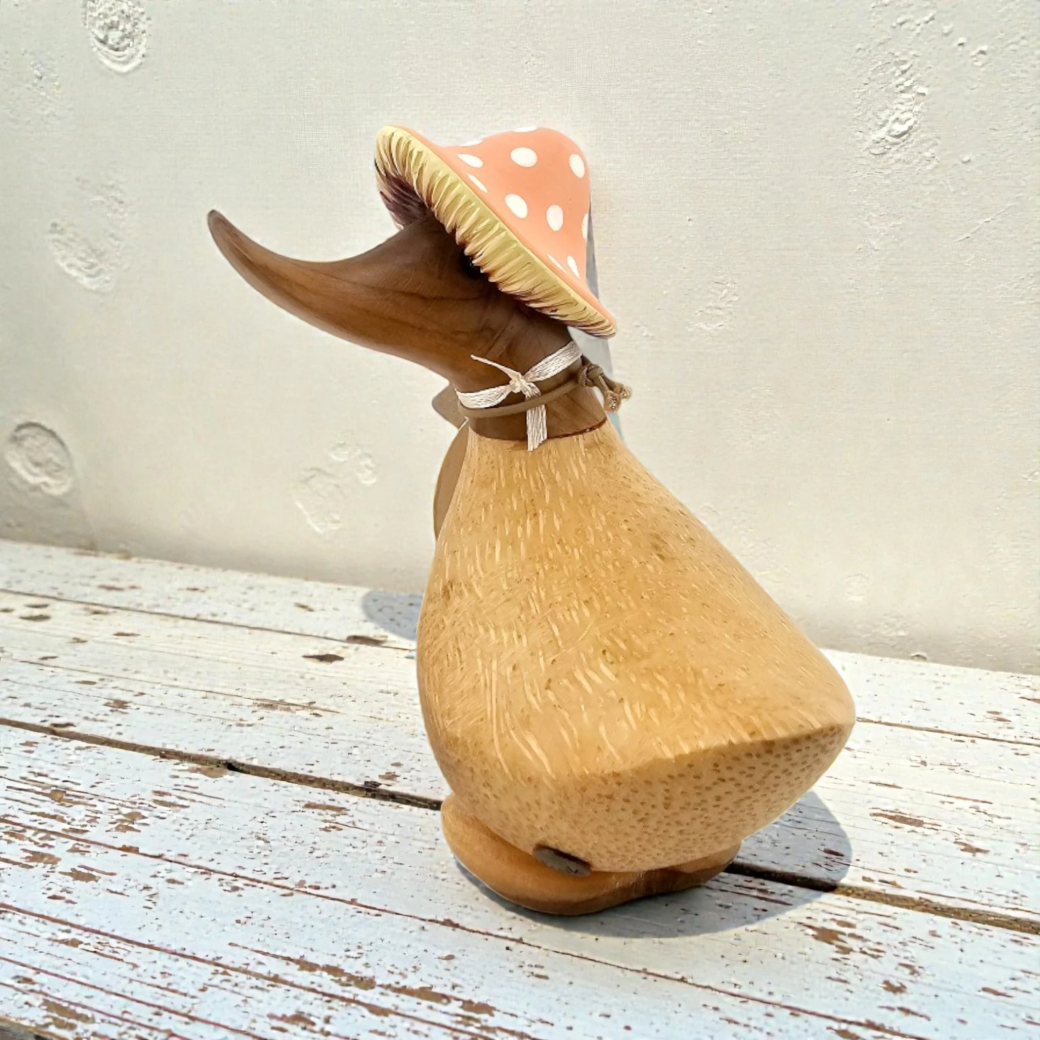 Each Toadstool Folk duckling is handcarved in Indonesia from a single piece of bamboo root, which means the grain, the tone, and the posture are unique to the individual. The warm honey timber shifts from piece to piece, marked by the natural texture of the root and the hand of the person who shaped it. There is no paint on the body, no costume beyond the hat. Just bamboo, carved with care into something that feels like it wandered in from somewhere older and quieter than here.