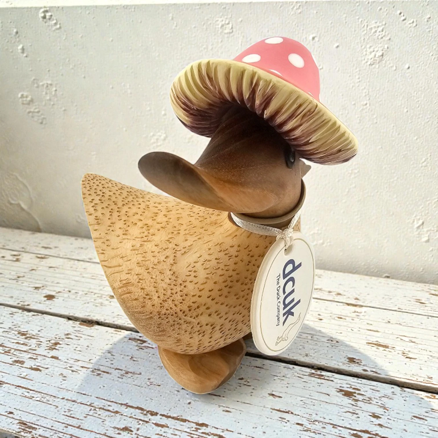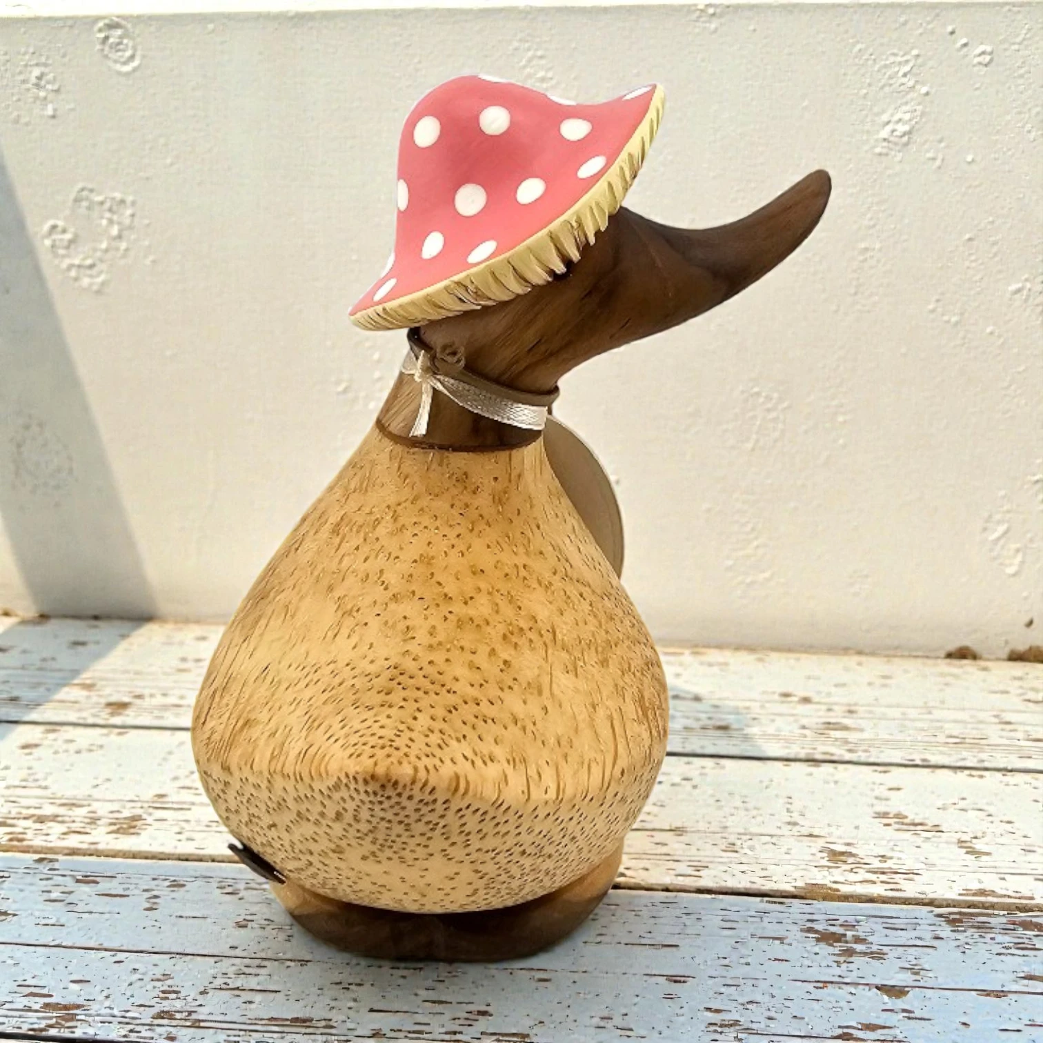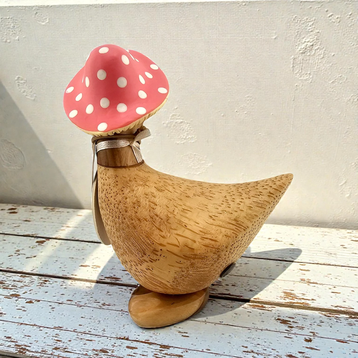 The boldest hat in the forest, worn without apology. A handcarved bamboo root duckling in a deep raspberry pink spotted toadstool hat, standing 11 cm tall with a name tag and zero interest in going unnoticed.